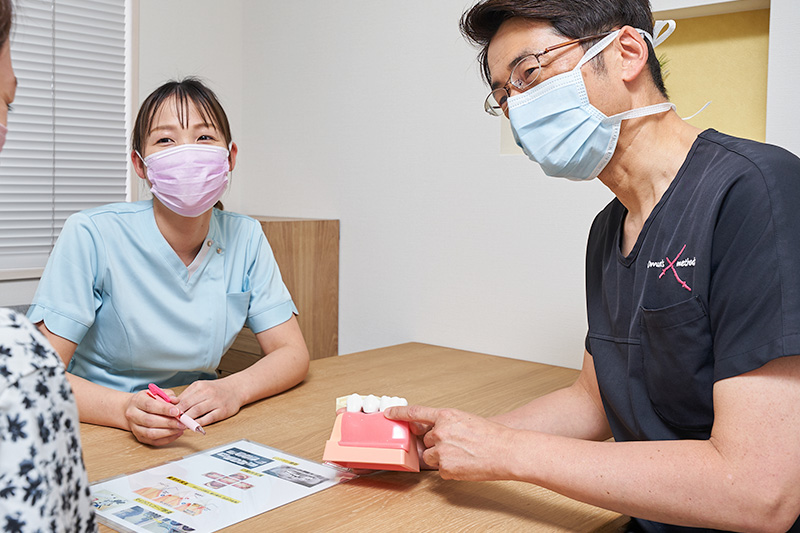 歯の本来の機能は噛むこと。そのため噛み合わせのバランスはとても重要です。改善のためにもともとあった歯を削るのではなく、「片方ばかりで噛んでしまう」「頬杖をやめられない」といった生活習慣の改善を促します。